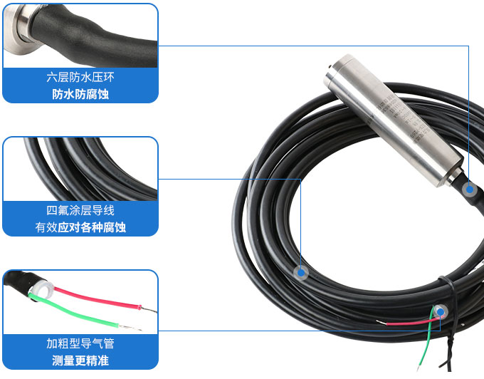 SIN-P260投入式液位變送器SIN-P260投入式液位變送器由高性能擴(kuò)散硅壓阻式壓力傳感器作為測量元件,把與液位深度成正比的液體靜壓力準(zhǔn)確測量出來,并經(jīng)過信號(hào)調(diào)理電路轉(zhuǎn)換成標(biāo)準(zhǔn)(電流或電壓)信號(hào)輸出,建立起輸出信號(hào)與液體深度的線性對應(yīng)關(guān)系,實(shí)現(xiàn)對液體深度的測量。產(chǎn)品精度高、體積小,直接投入液體中,即可測量出變送器末端到液面的液體高度,使用方便。適用于石油、化工、電廠、城市供水、水文勘探領(lǐng)域的液位測量與控制。經(jīng)過長期老化及穩(wěn)定性篩選,產(chǎn)品性能穩(wěn)定可靠,能夠適用應(yīng)用于環(huán)境比較惡劣的露天現(xiàn)場,同時(shí)能夠現(xiàn)場液位顯示,零點(diǎn),滿程可遷移。